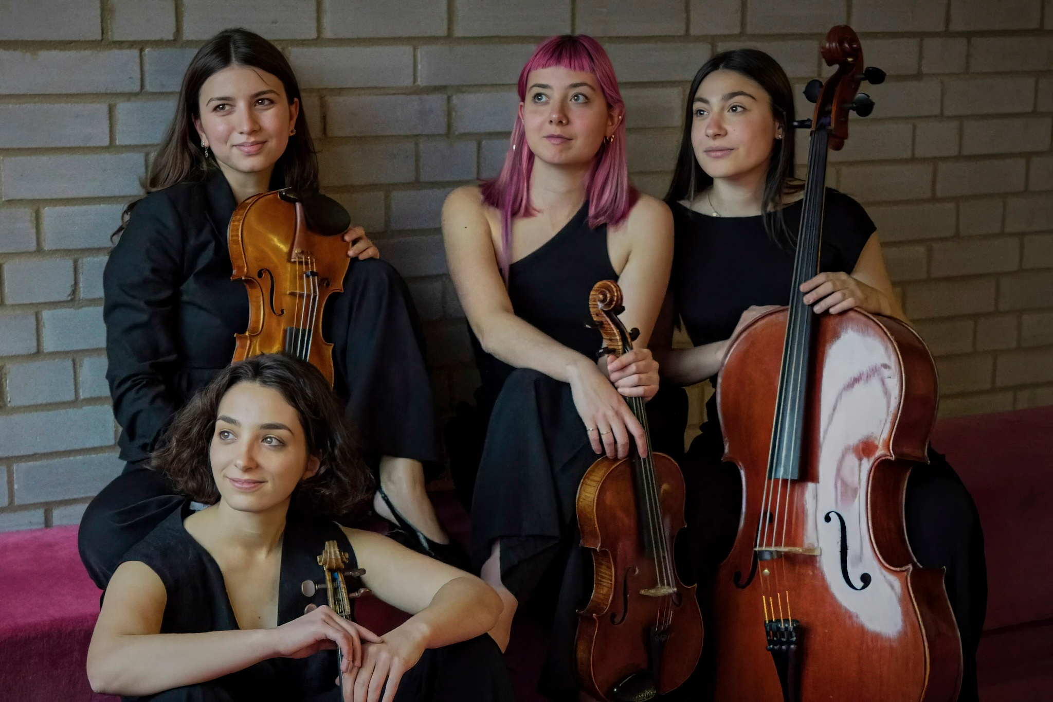 Vier junge Frauen mit klassischen Instrumenten, es ist das Quartetto Alioth bestehend aus Matilde Urbani (Geige), Sofia Morano (Geige), Anna Avilia (Bratsche) und Margherita Pasquini (Cello)